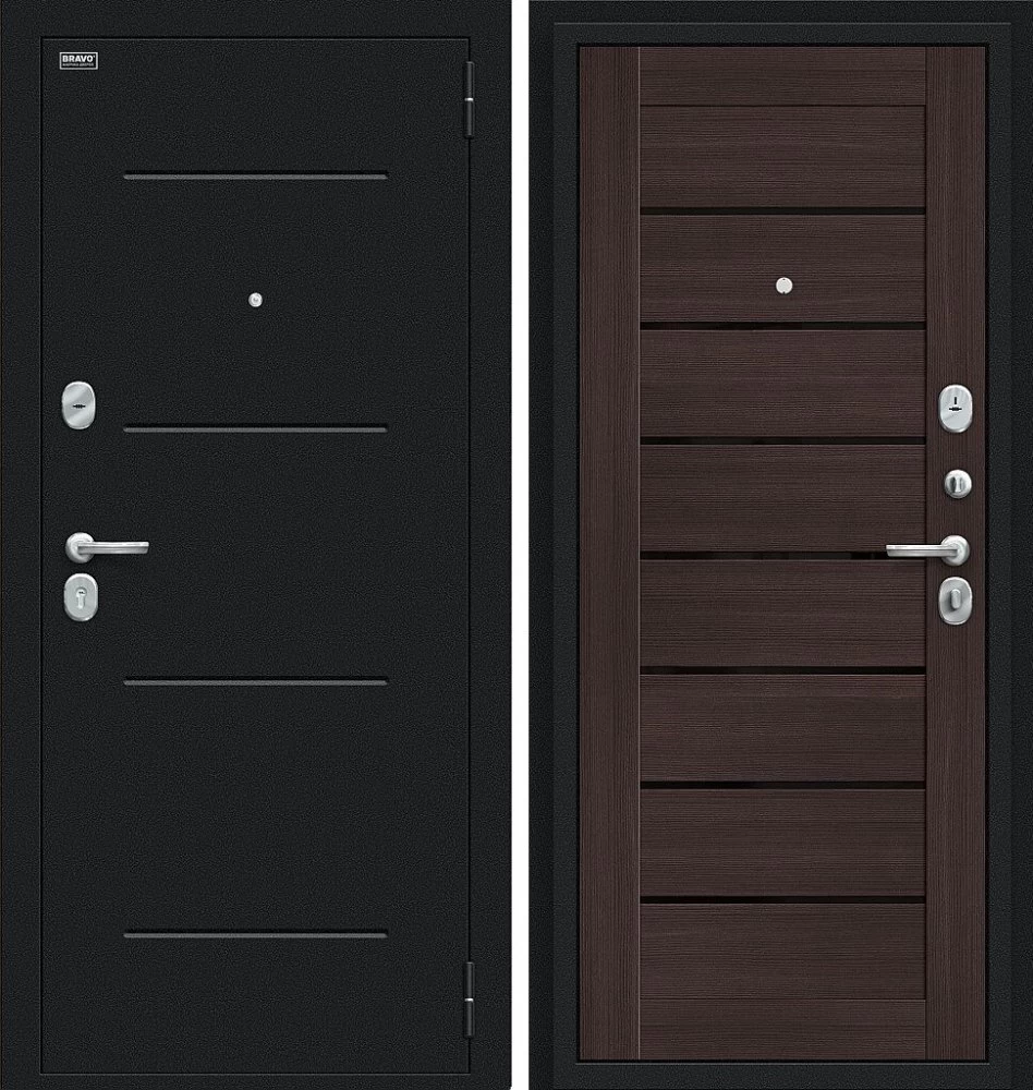 Надежная входная Дверь Браво Техно Букле черное/Wenge Veralinga премиум класса по цене 31 361 руб. Большая толщина стали защитит от проникновения в ваш дом, квартиру или коттедж. Используется очень качественная фурнитура: замки, цилиндры, ручки, защелки. Покрытие и отделка двери изготовлено под внимательным контролем производителя. Дверь имеет долгий срок службы и гарантию.